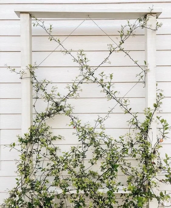 We’ve started some of the exterior work (cobblestones and pea stone around the perimeter) and plan to add window boxes and simple climbing plants like this. Image via Pinterest.